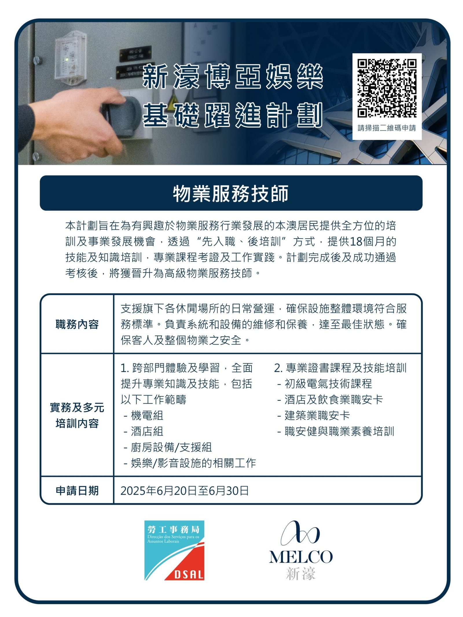 【就業資訊】勞工事務局新濠博亞娛樂基礎躍進計劃 – 物業服務技師,現正接受報名!