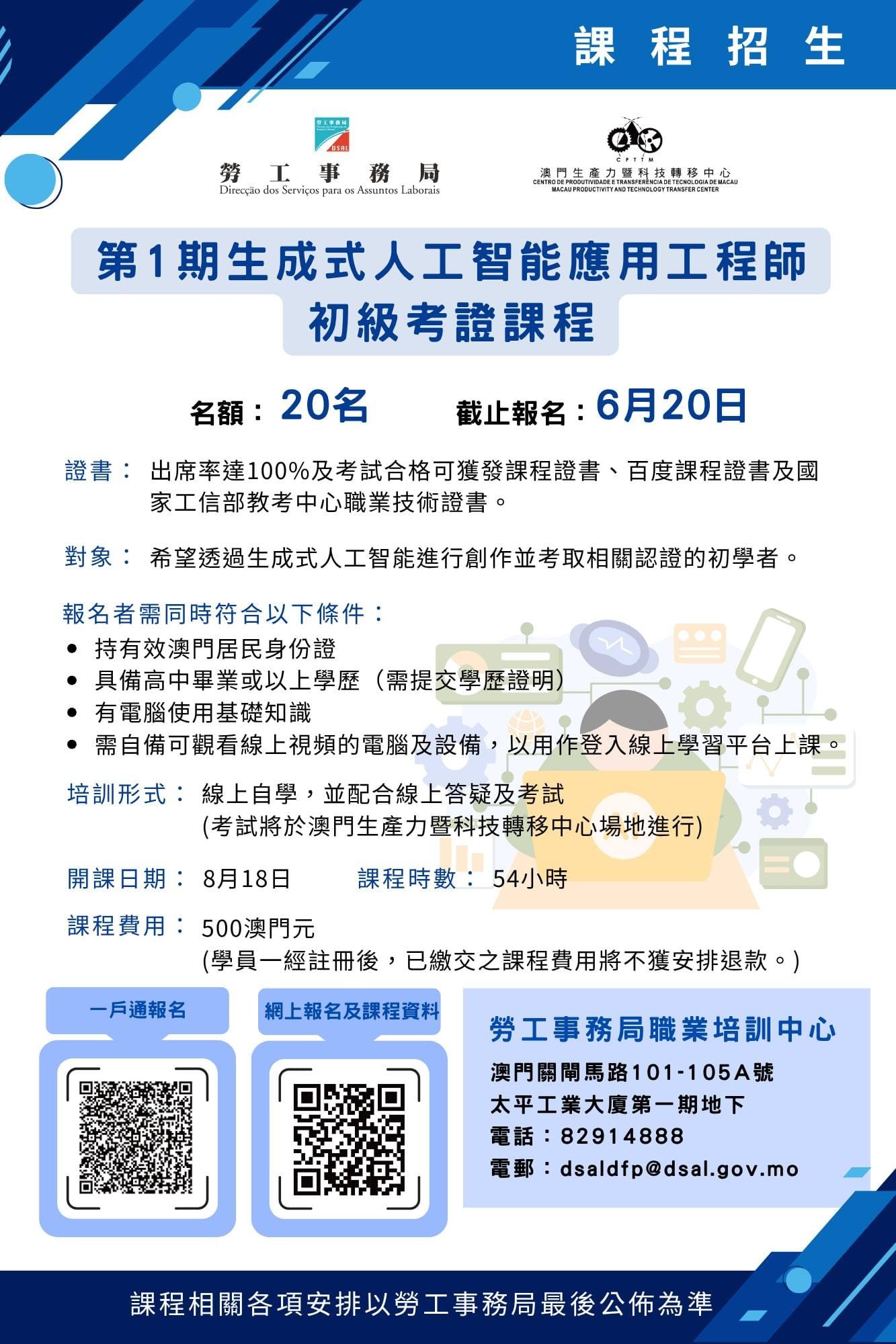 【上課地點】線上自學及導師於線上答疑,考試地點:澳門生產力暨科技轉移中心—數碼匯點(南灣馬統領街廠商會大廈三樓)