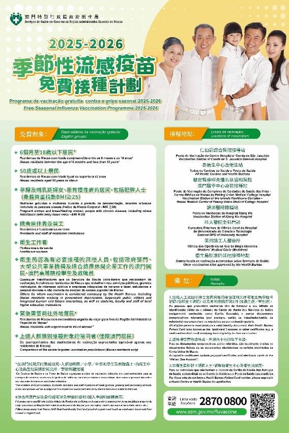 衛生局為保障長者、慢性病人、孕婦和幼兒等高風險人群及居民的健康,自9月30日起已優先為流感高風險人士免費接種2025至2026年度季節性流感疫苗;而醫護人員也持續推動長者接種流感疫苗,加快安排院舍、托兒所及中小幼學校等重點場所進行集體接種。截至10月16日,已有近4萬2千人接種流感疫苗,各類高風險人群接種率均較去年同期高。