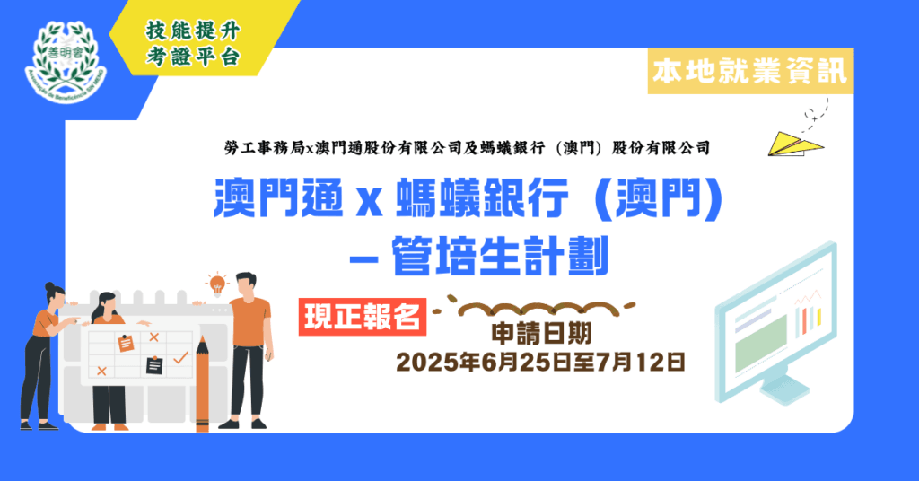 為支持本地人才全面發展,拓展多元職涯路向,勞工事務局(下稱勞工局)和澳門通股份有限公司(下稱澳門通)及螞蟻銀行(澳門)股份有限公司(下稱螞蟻銀行(澳門))合作推出“澳門通 x 螞蟻銀行(澳門)—管培生計劃"(下稱計劃),以“先入職、後培訓"方式,為有志投身金融科技和數字經濟發展的澳門青年,提供全方位的培訓及事業發展機會,計劃由6月25日起接受申請。