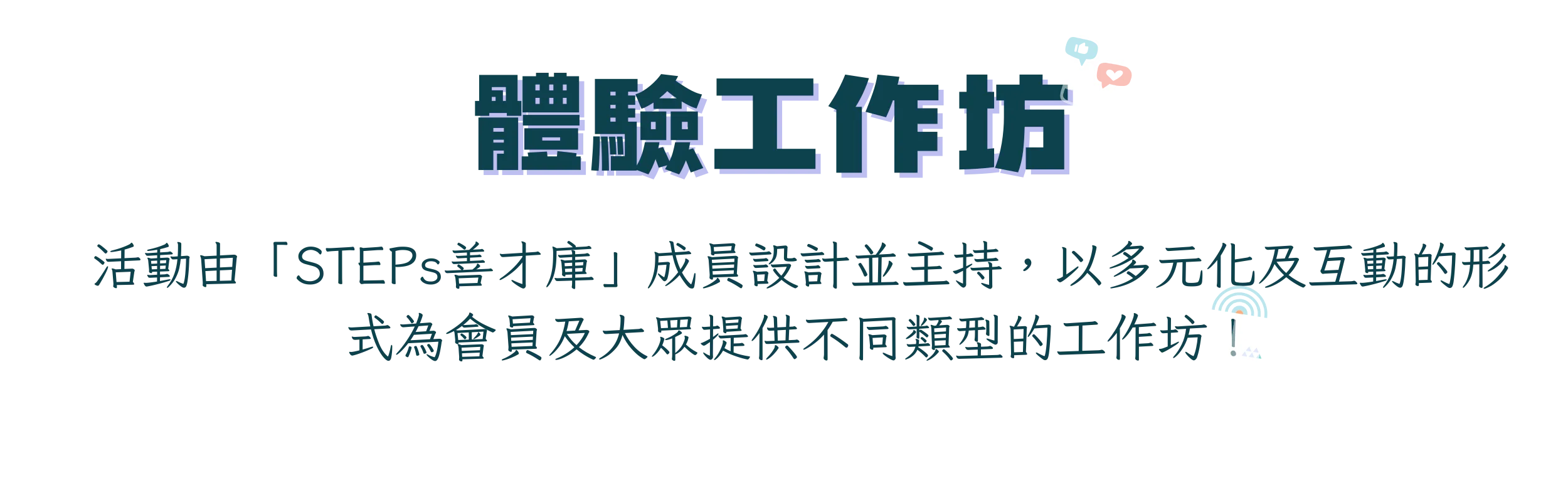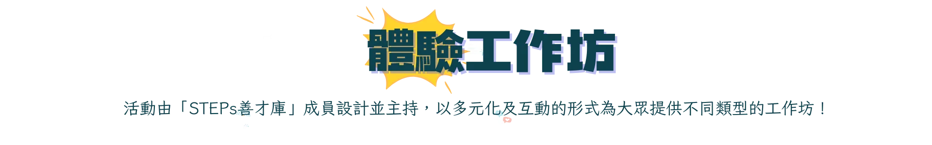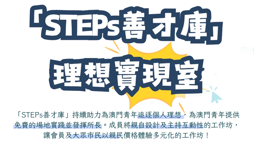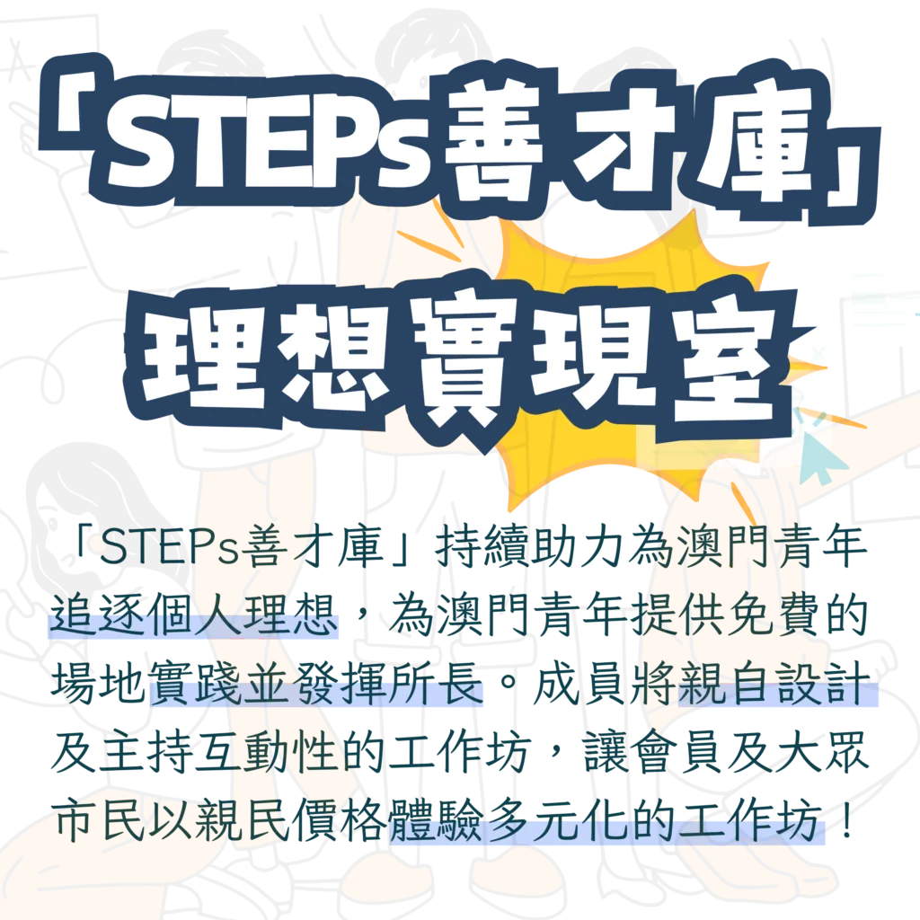本空間為青年提供多元化的發展機會。並為合作單位及「STEPs善才庫」成員提供預約形式的場地空間,全力支持青年的個人發展。
